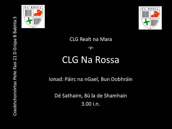 Guímid gach rath ar CLG Na Rossa faoi 21 inniu ina gcluiche Babhta 3 as baile i gcoinne CLG Realt na Mara, Bun Dobhráin.