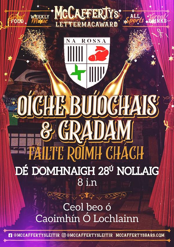 Tugann CLG Na Rossa cuireadh duit chuig Oíche Buíochas & Gradam ar an Domhnaigh, 28ú Nollaig i McCaffertys Leitir Mhic an Bhaird, ag tosadh ag 8i.n. Fáilte roimh cách ... Bigí Linn!!!!