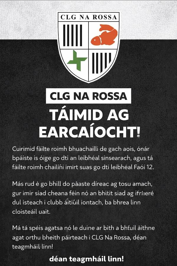 Má tá spéis agatsa nó le duine ar bith a bhfuil aithne agat orthú bheith páirteach i CLG Na Rossa, déan teagmháil linn!